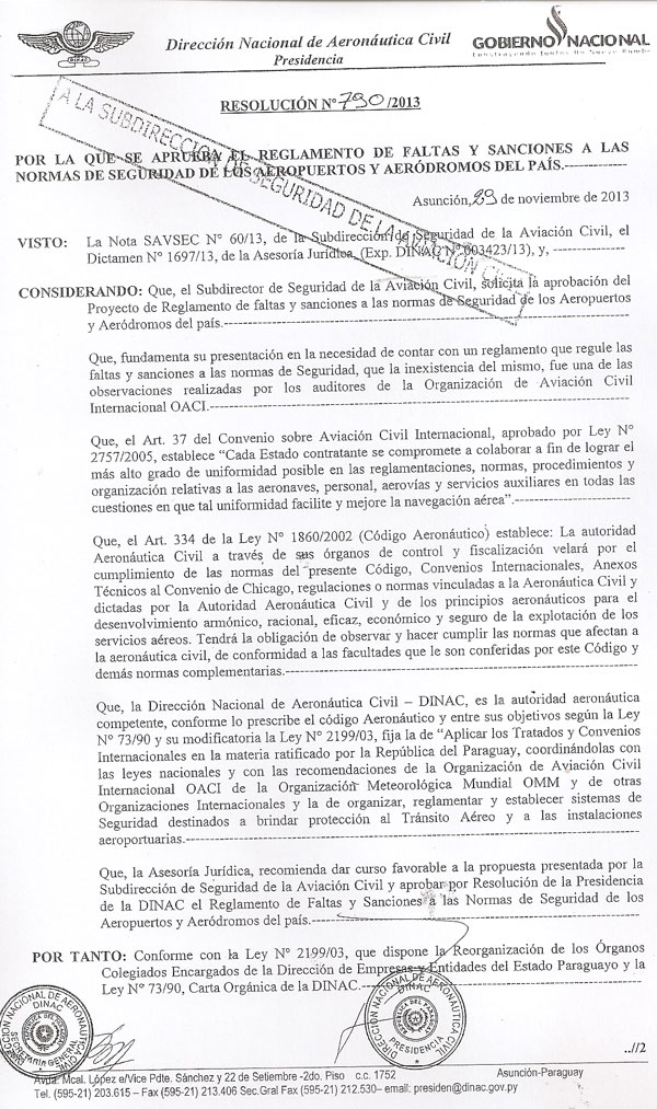 Por la que se aprueba el reglamento de faltas y sanciones a las Normas de Seguridad de los Aeropuertos y Aeródromos del País.